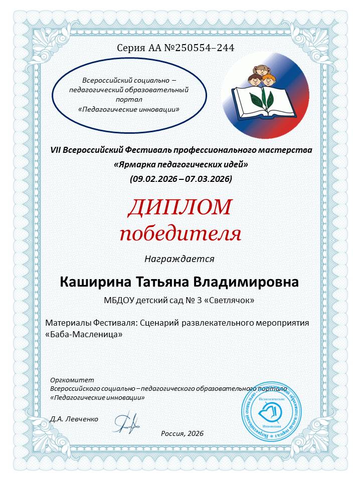 Всероссийский конкурс «Педагогические инновации». Номинация «Педагогические проекты». Название работы: «Этот славный День победы»